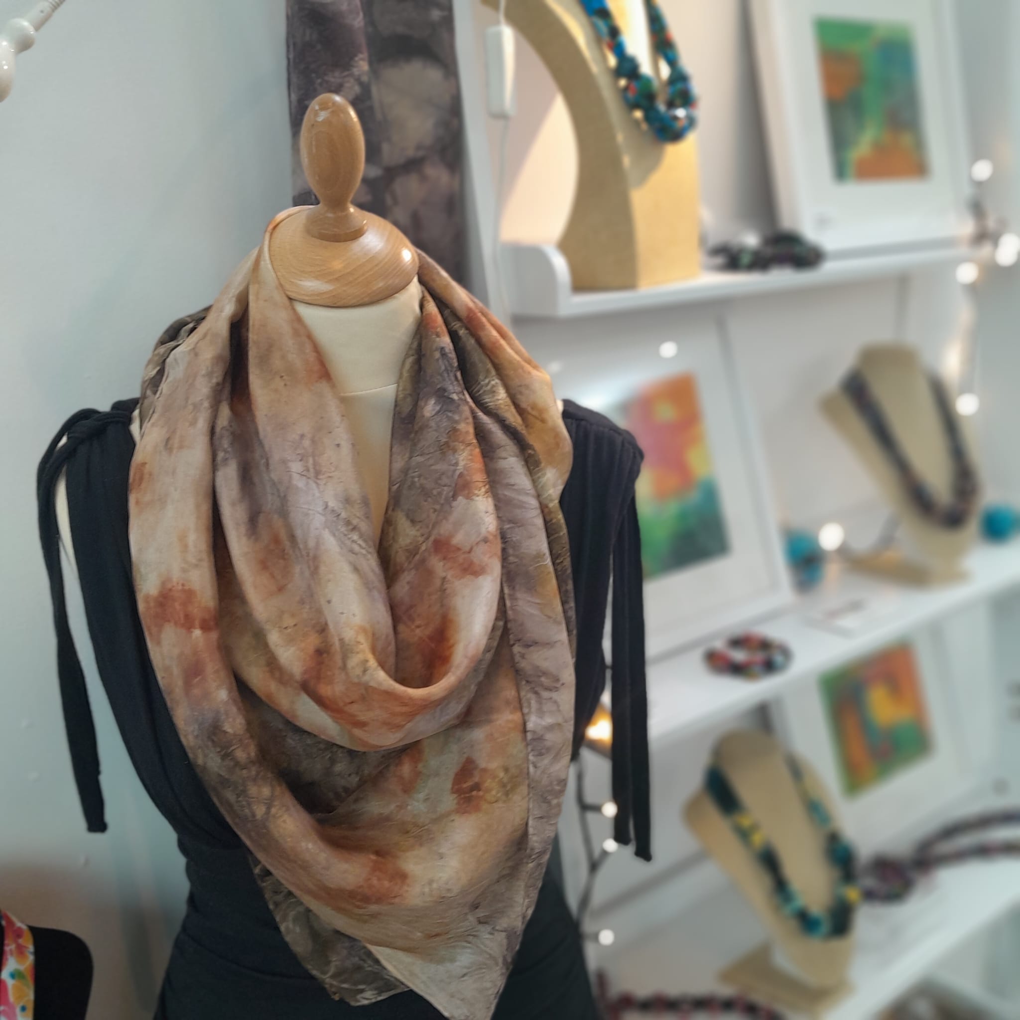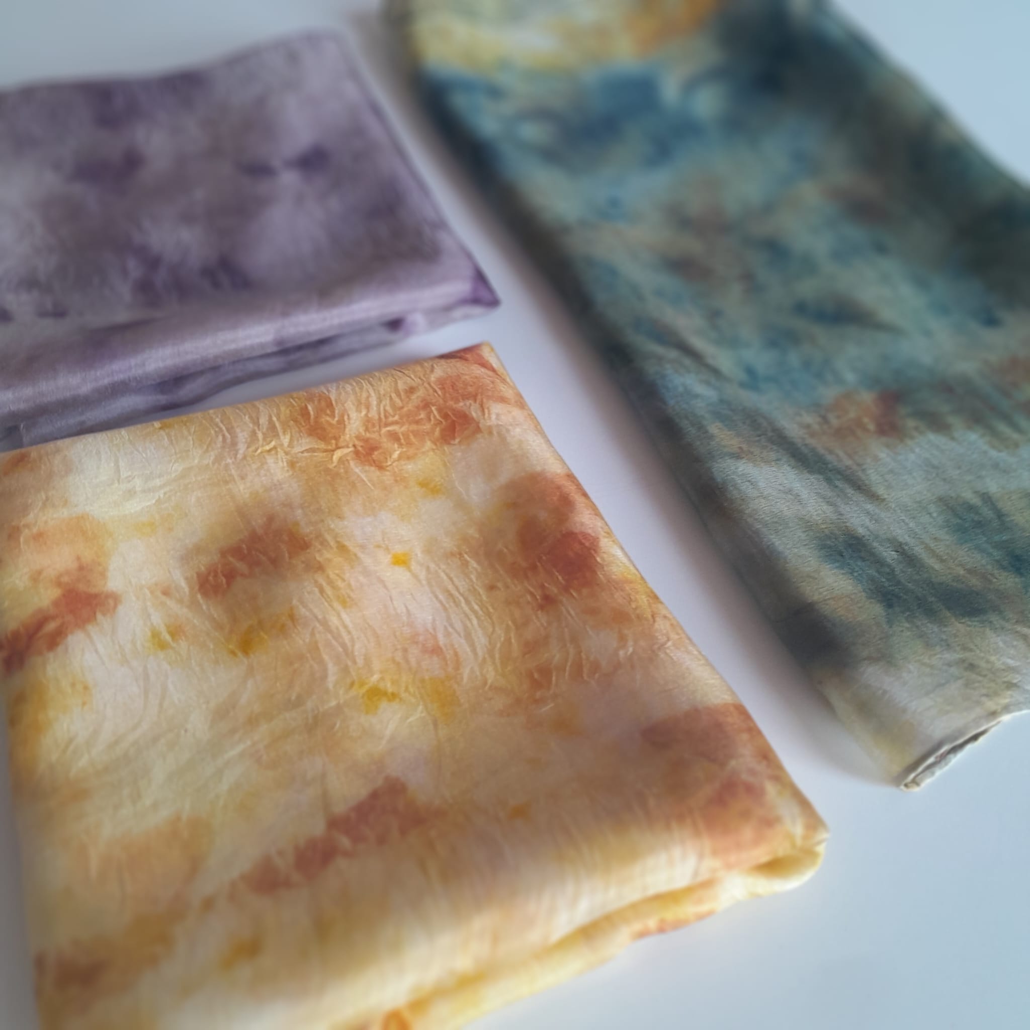 My creative process revolves around the dynamic beauty of marbling on water, where colours and patterns emerge and transform spontaneously. Combining traditional methods with digital design, I’m also exploring more sustainable practices. In 2023, I completed a Natural Dyeing course at Ditchling Museum of Art, which has deepened my passion for natural dyes, eco printing, and growing my own plants to create unique, nature-inspired textiles. Alongside my artistic practice, I run marbling and botanical printing workshops across Kent and am a qualified Arts Counsellor, integrating creativity and wellbeing through my work with the Brain and Spine Foundation’s Neuro Creatives project.